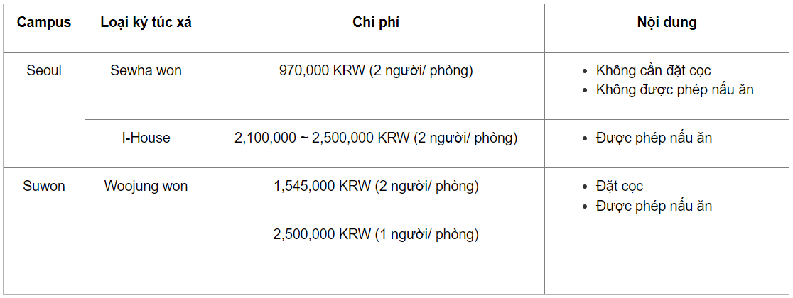 » Ký túc xá: 1,300,000 KRW/ 10 tuần/ 1 kỳ